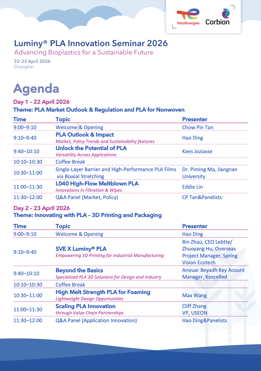 - Day 1 – 22 April 2026 – PLA Market Outlook & Regulation and PLA for Nonwoven